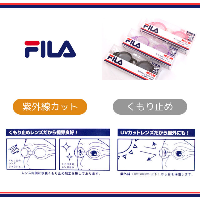FILA(フィラ) スイミングゴーグル キッズ メンズ レディース 兼用 UVカットくもり止め 水泳 ゴーグル 競泳 水中メガネFILA(フィラ) スイミングゴーグル キッズ メンズ レディース 兼用 UVカットくもり止め 水泳 ゴーグル 競泳 水中メガネ商品説明FILA(フィラ) 子供 大人兼用 スイミングゴーグルくもり止め加工UVカット加工2サイズ調整の鼻ベルト素 材素材レンズ:ポリカーボネートフェイスパッド・ストラップ・鼻ベルト:エラストマーサイズ10才〜大人※ 実寸平置きのサイズとなります。