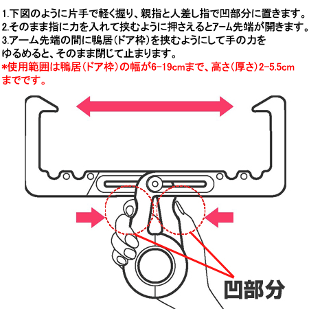 ■サイズ:約縦26.5×横15×厚み1.6cm■材質:本体:ポリプロピレン、バネ:鋼■その他:耐荷重:8kg、耐熱温度:100度・雨の日、外出時など、室内干しが必要な時に便利・ドア枠、ふすま、障子などの鴨居に取り付け簡単・1個使用で洗濯ハンガー、2個使用でポールなど使用できます*ご注意ください!使用範囲は鴨居(ドア枠)の幅が6〜19cmまで、高さ(厚さ)が2〜5.5cmまでとなります。