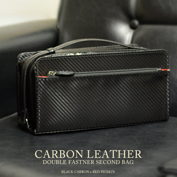 セカンドバッグ メンズ ダブルファスナー【送料無料】カーボンレザー セカンドバック 鞄 カバン かばん カーボン×豚革ピッグスキン 男性用 紳士物 黒 ブラック 赤 レッド かっこいい カッコイイ バレンタイン