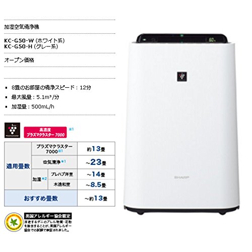 シャープ 加湿 空気清浄機 プラズマクラスター 7000 スタンダード 13畳 / 空気清浄 23畳 ホワイト KC-G50-W
